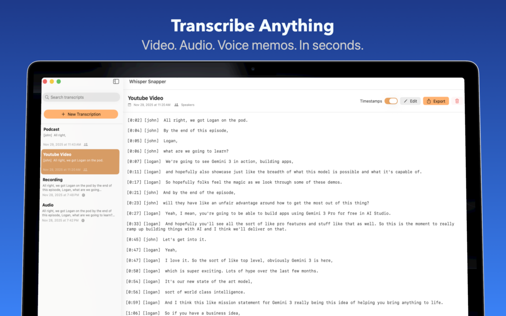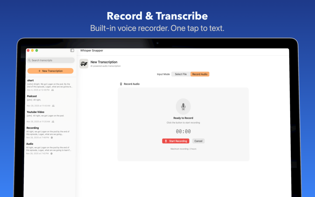From quick voice memos to hour-long interviews, Whisper Snapper handles it all with accuracy and speed.
