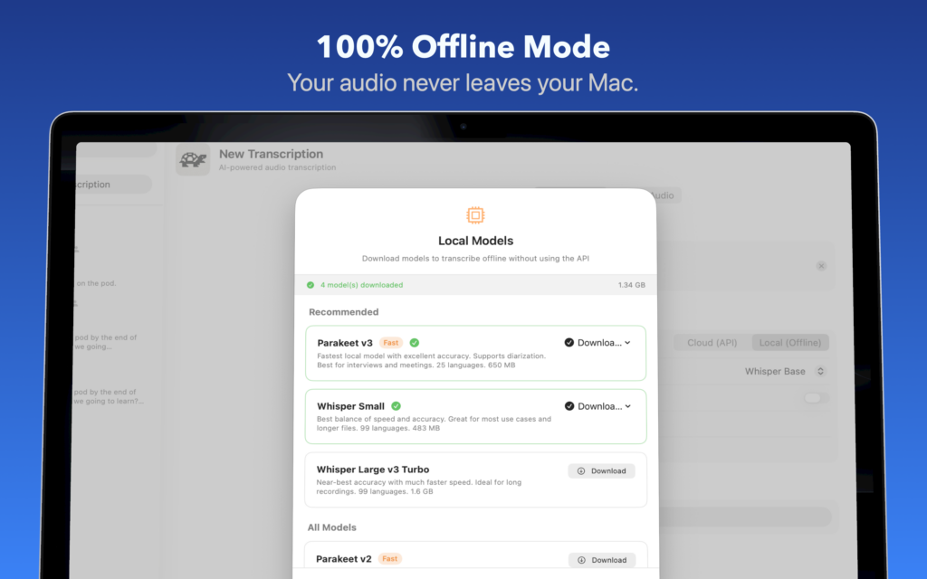 Your recordings. Your Mac. Unlike cloud-only transcription tools, Whisper Snapper lets you process sensitive audio entirely on your device. Download industry-leading AI models once, then transcribe forever — no internet required.
