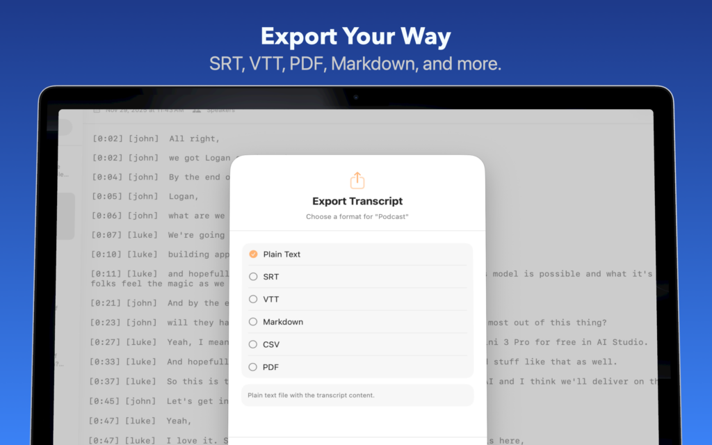 Transcribe videos, podcasts, meetings, and voice memos with AI. Works 100% offline with local models — your audio never leaves your Mac.